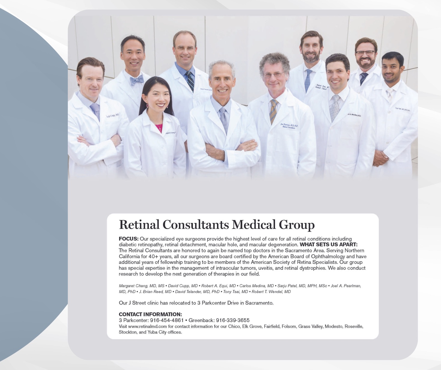 Each year local Sacramento publications Sacramento Magazine and SacTown Magazine dedicate an issue to recognize the best in healthcare that Sacramento has to offer. Retinal Consultants Medical Group is pleased to announce that our physicians are being recognized as “Top Docs” for the fifth year in a row in Sacramento Magazine and for the first time in SacTown Magazine.